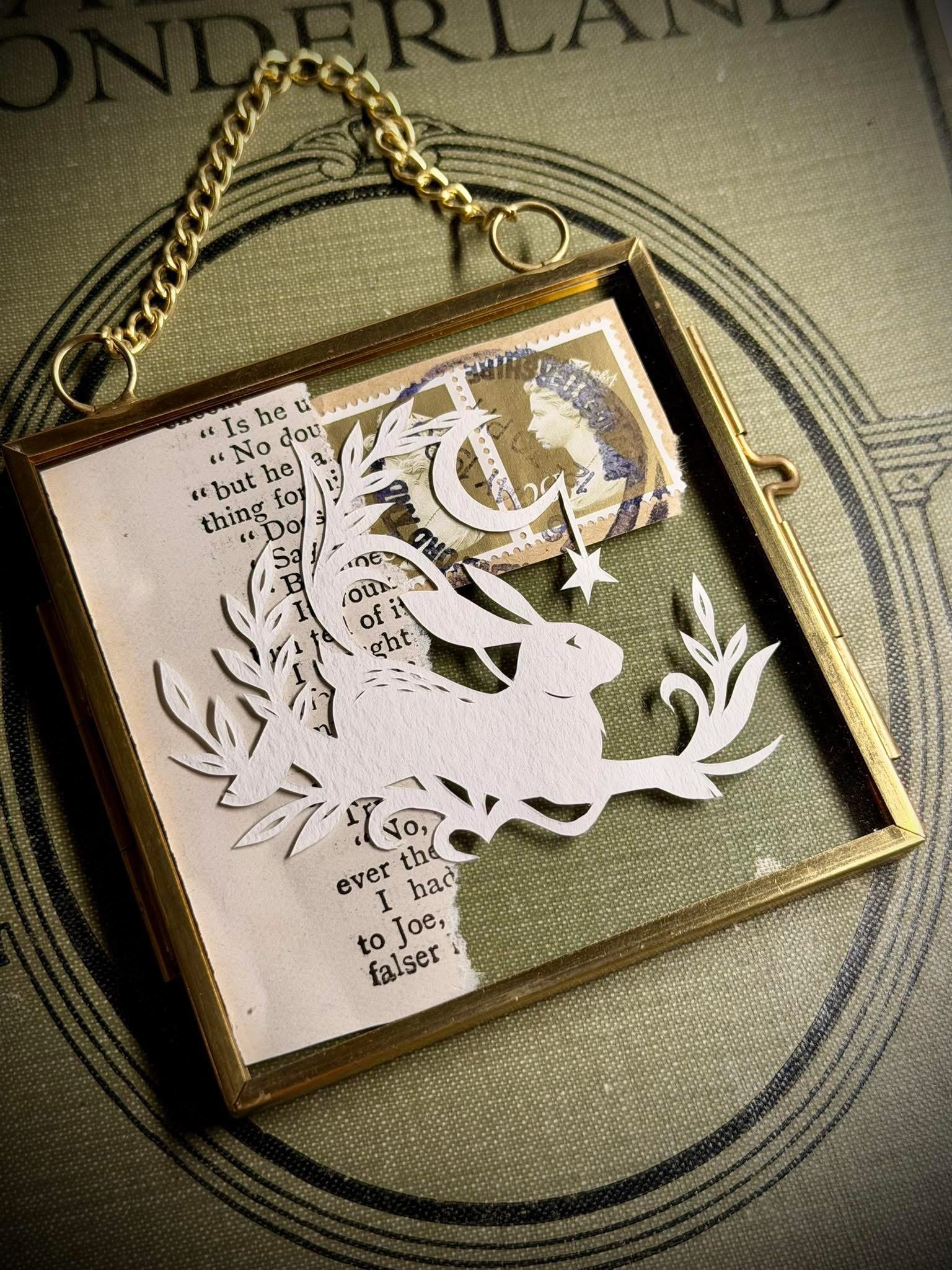 Original papercut sandwiched within a double glass brass frame. Hand cut and compiled by Lou.