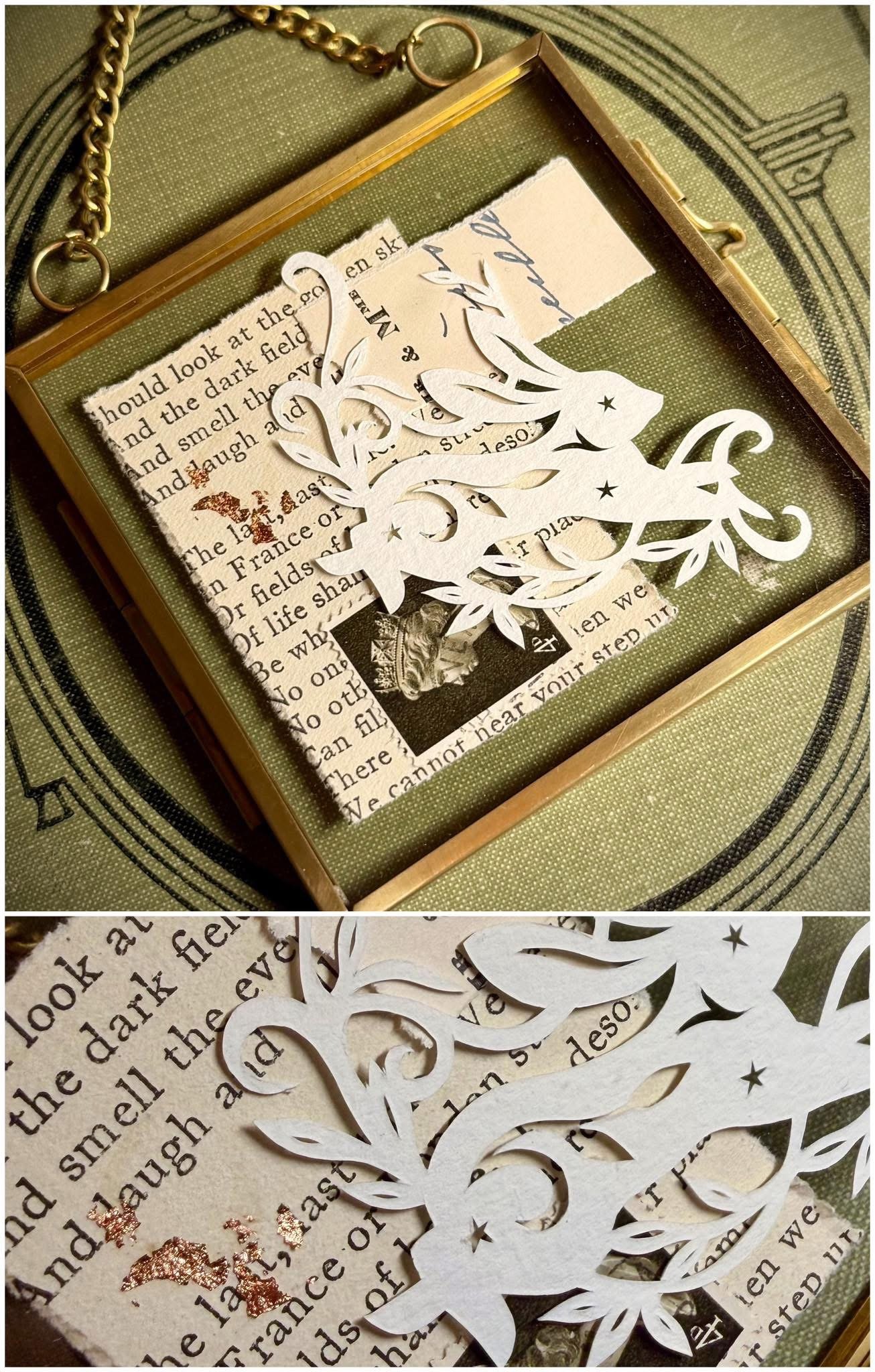Original papercut sandwiched within a double glass brass frame. Hand cut and compiled by Lou.