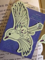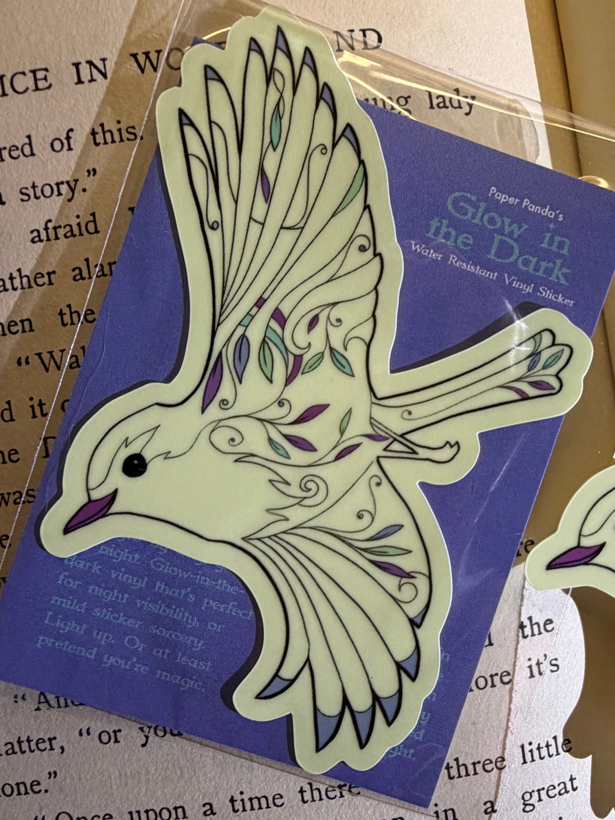A magical flying bird sticker made from glow in the dark vinyl that REALLY glows brightly.