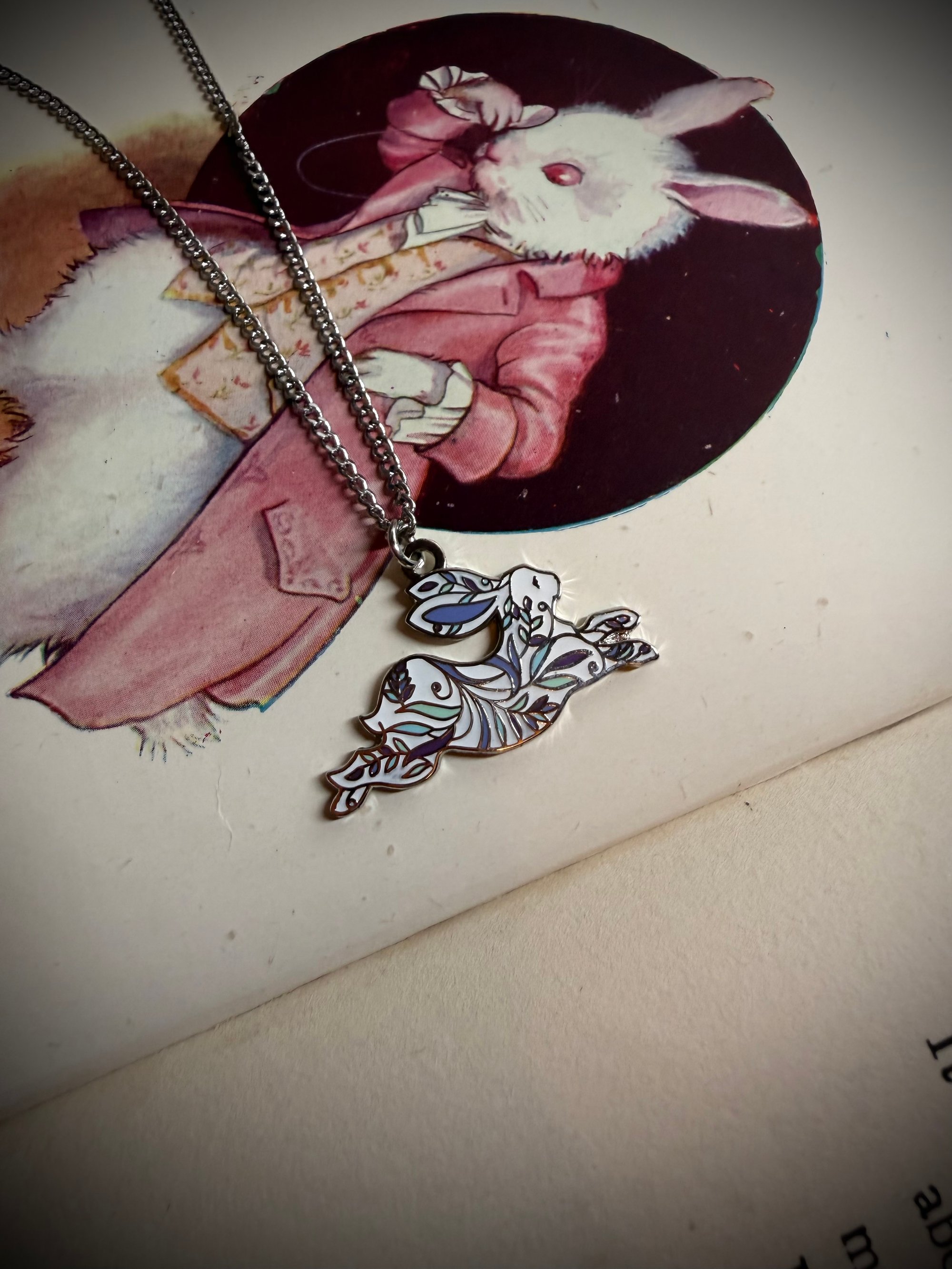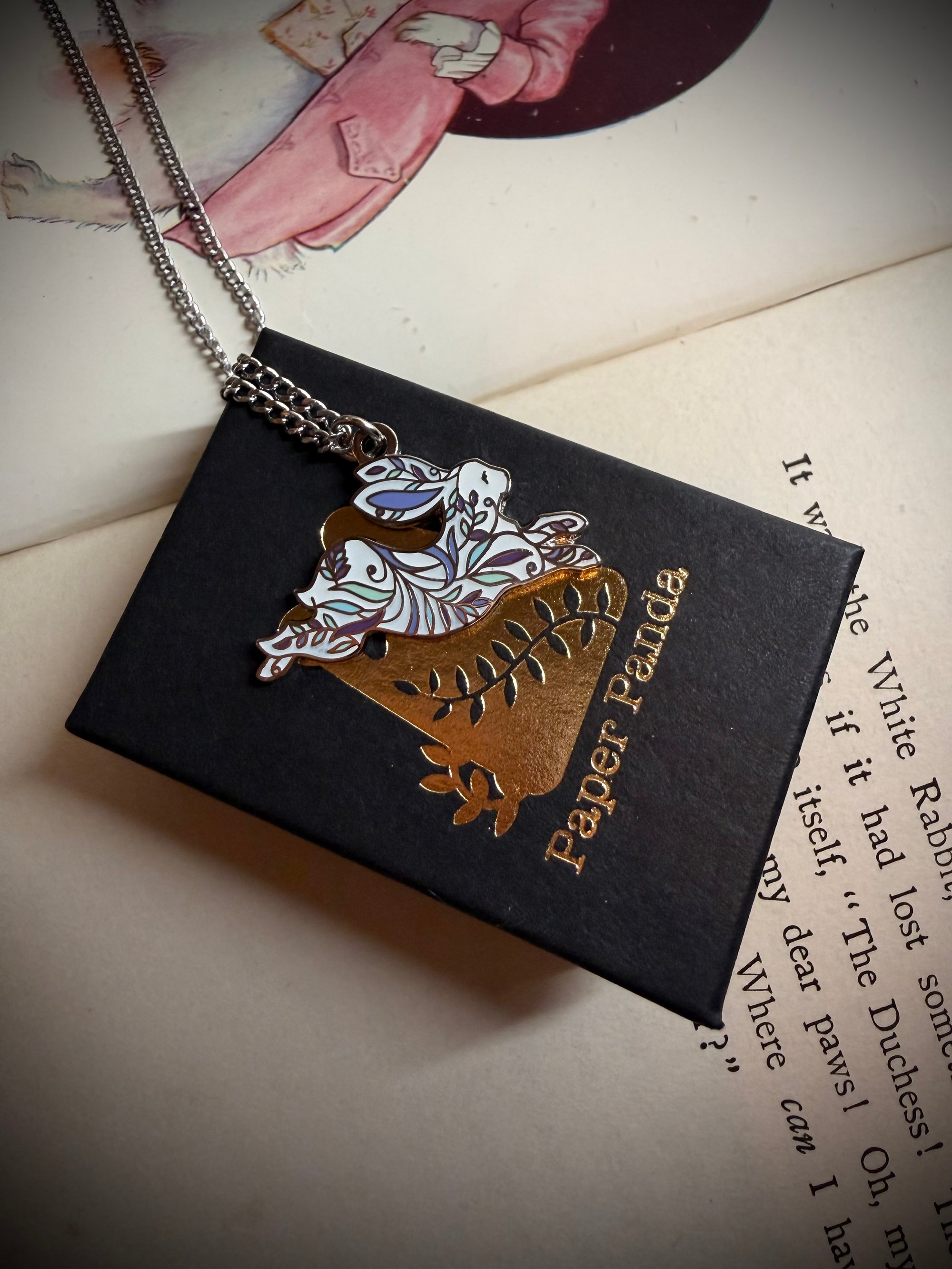 This beautiful hard enamel, silver coloured necklace depicts a rabbit with leaves and swirls typical of Paper Panda style. Glows beautifully in the dark.