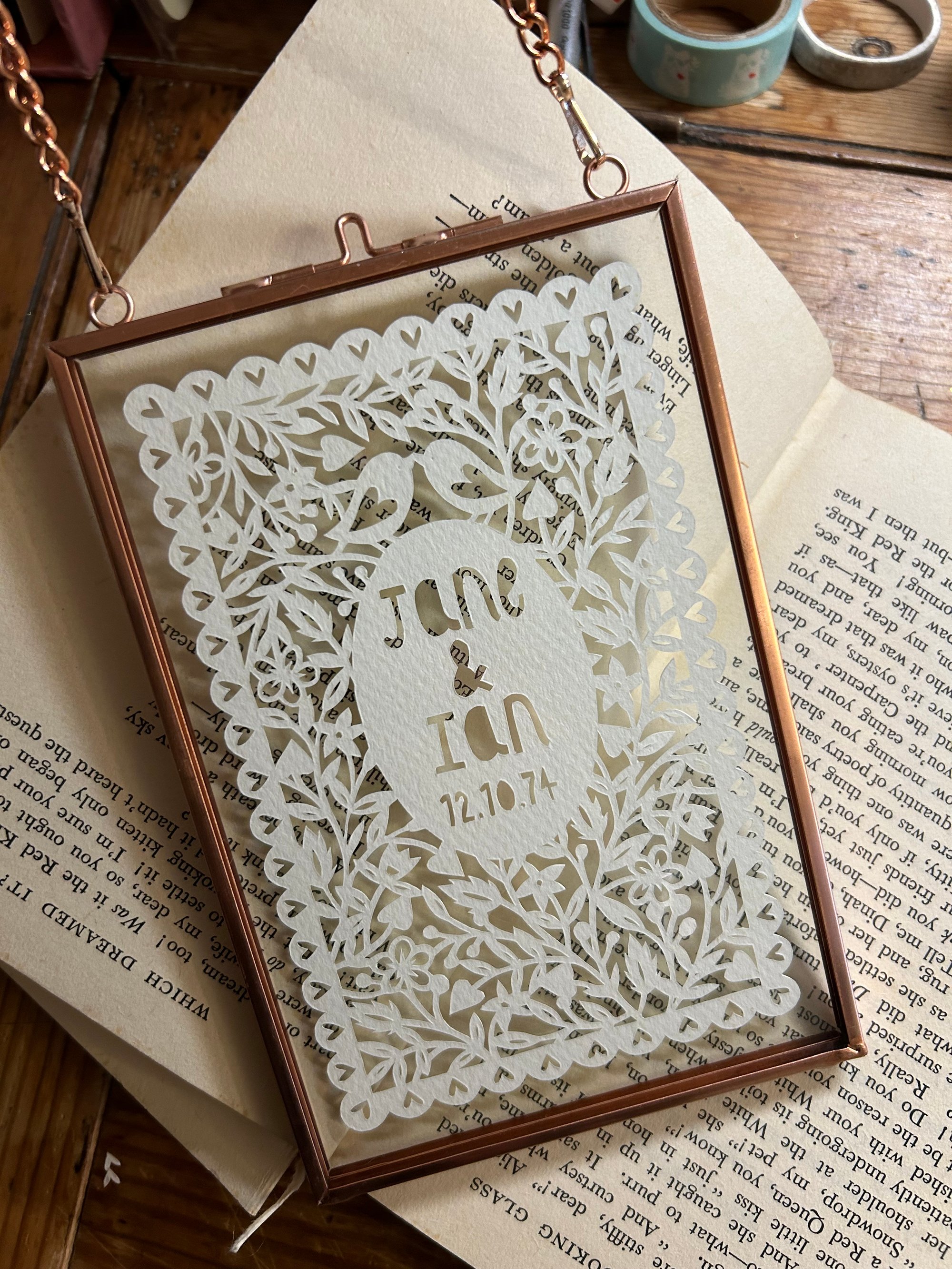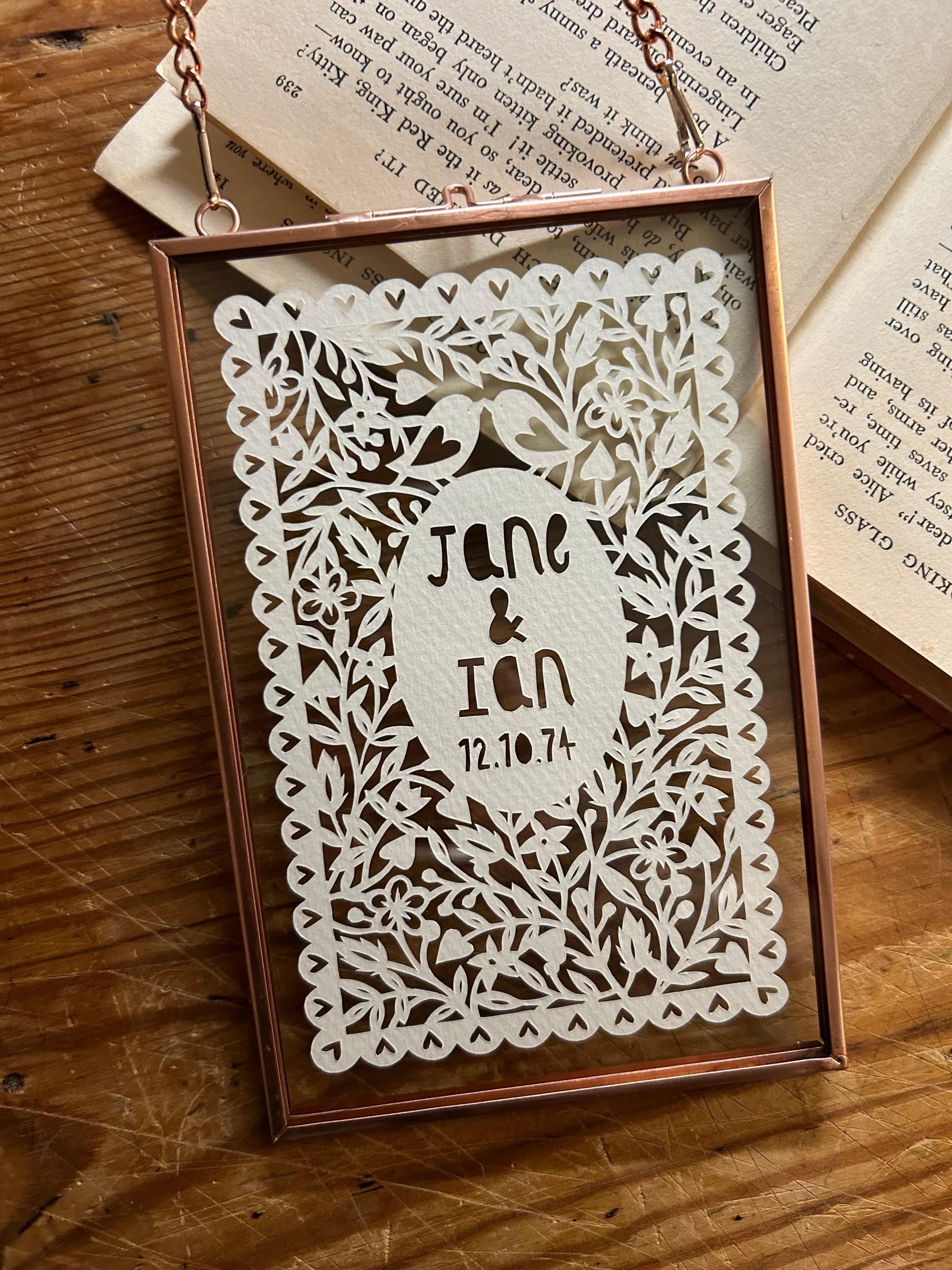 A 4x6”(framed size - or a little smaller to fit this size frame later if you choose unframed) folk art style papercut with your choice of centre wording.